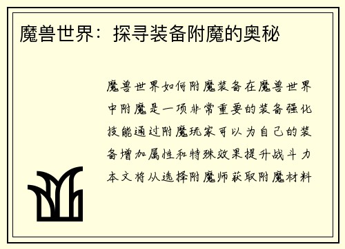 魔兽世界如何附魔装备 在魔兽世界中,附魔是一项非常重要的装备强化技能。通过附魔,玩家可以为自己的装备增加属性和特殊效果,提升战斗力。本文将从选择附魔师、获取附魔材料、选择适合的附魔、附魔过程、附魔效果...