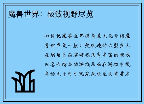 如何把魔兽世界视角最大化 介绍 魔兽世界是一款广受欢迎的大型多人在线角色扮演游戏,拥有丰富的游戏内容和精美的游戏画面。在游戏中,视角的大小对于玩家来说至关重要。本文将为您介绍如何最大化魔兽世界的视角,...