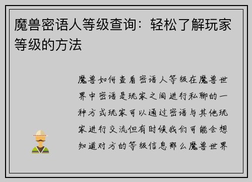 魔兽如何查看密语人等级 在魔兽世界中,密语是玩家之间进行私聊的一种方式。玩家可以通过密语与其他玩家进行交流,但有时候我们可能会想知道对方的等级信息。那么,魔兽世界中如何查看密语人的等级呢?下面将从多个...