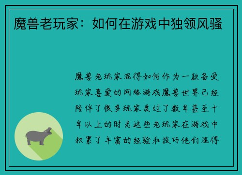 魔兽老玩家混得如何 作为一款备受玩家喜爱的网络游戏,《魔兽世界》已经陪伴了很多玩家度过了数年甚至十年以上的时光。这些老玩家在游戏中积累了丰富的经验和技巧,他们混得如何呢?以下是从8个方面对魔兽老玩家的...