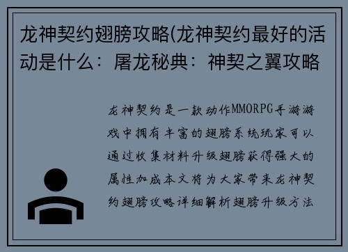 《龙神契约》是一款动作MMORPG手游,游戏中拥有丰富的翅膀系统,玩家可以通过收集材料升级翅膀,获得强大的属性加成。本文将为大家带来龙神契约翅膀攻略,详细解析翅膀升级方法以及屠龙秘典活动中的神契之翼。...